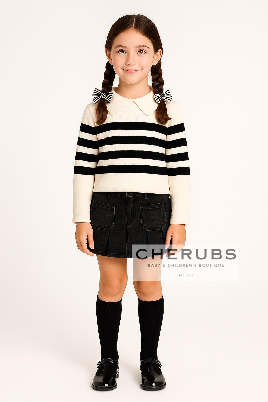 Girls Spanish black stripe jumper with oversized collar and grey black denim pleated skirt.